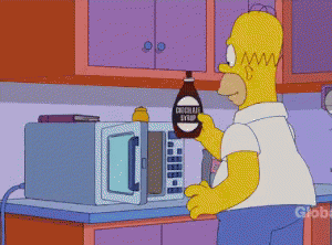 Homero Simpson attempts to microwave various items, including chocolate syrup and sausages, before messily eating from a box.