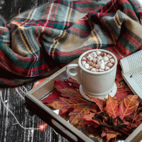 A warm mug of hot chocolate with marshmallows, surrounded by vibrant autumn leaves, an open book, and a cozy plaid blanket.