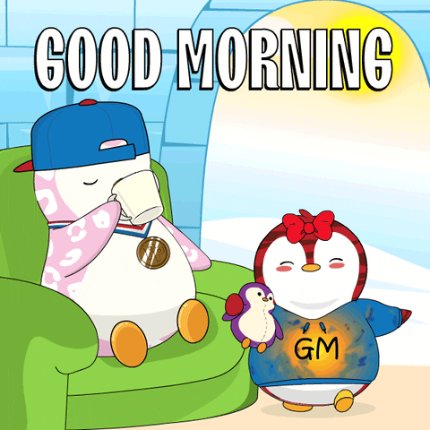 Two cute penguins enjoying a good morning with coffee, one relaxing on a couch.
