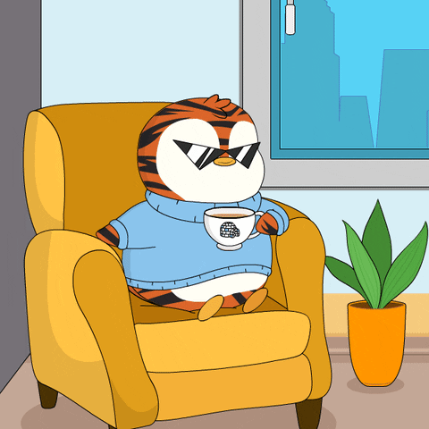 A cool Pudgy Penguin wearing sunglasses relaxes on a yellow armchair, enjoying a hot cup of coffee.