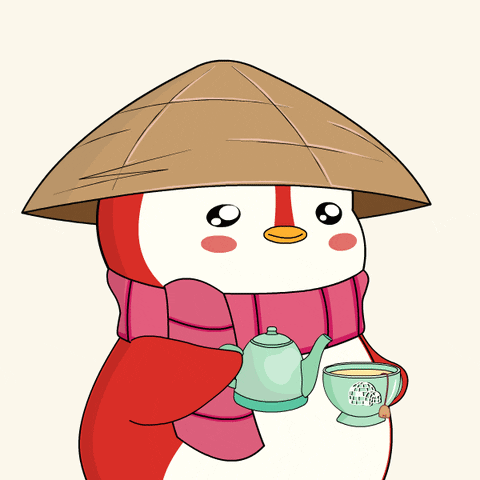 A cute Pudgy Penguin wearing a conical hat and pink scarf, pouring tea from a teapot into a cup.