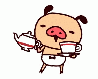 A cute cartoon pig in a diaper skillfully pours coffee from a teapot into a cup, acting as a diligent waiter.