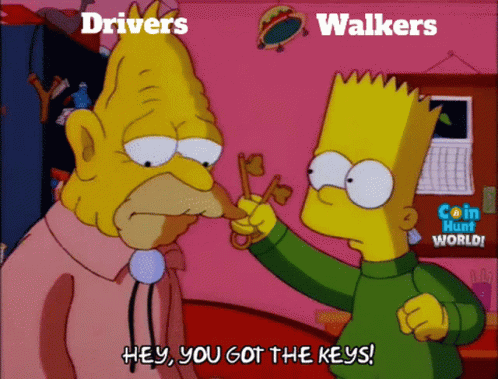 A meme featuring Homer and Bart Simpson, labeled "Drivers" and "Walkers," with Bart asking, "HEY, YOU GOT THE KEYS!"