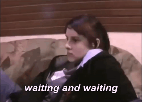 Kathrin Fricke, known as Coldmirror, sits on a couch, looking bored and impatient with the caption 'waiting and waiting'.