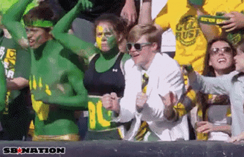 Fans at a college game cheer and dance enthusiastically, some with green and yellow face paint.