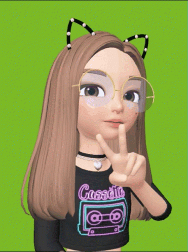 Animated avatar with cat ears, glasses, and 'Cassette' shirt makes a peace sign with a color purple aesthetic.
