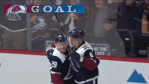 Colorado Avalanche players, led by Erik Johnson, celebrate a thrilling goal on the ice, surrounded by cheering teammates.