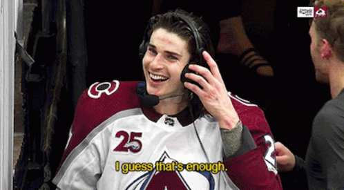 Colorado Avalanche player Ryan Graves smiles and says 'I guess that's enough' during an interview.