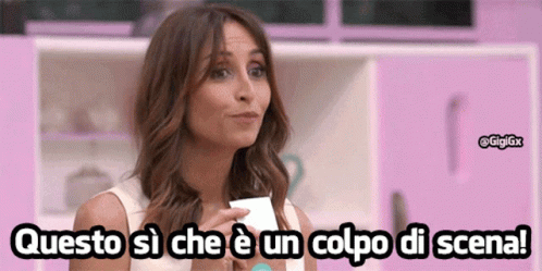 Benedetta Parodi holding a paper with the Italian phrase 'Questo sì che è un colpo di scena' (This is a twist).