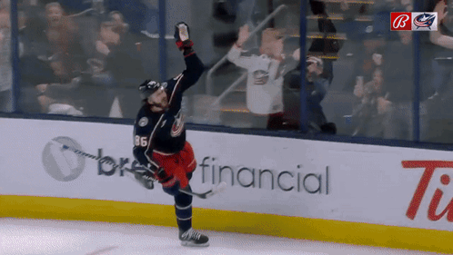 Kirill Marchenko of the Columbus Blue Jackets celebrates a goal on the ice, pumping his fist in excitement.