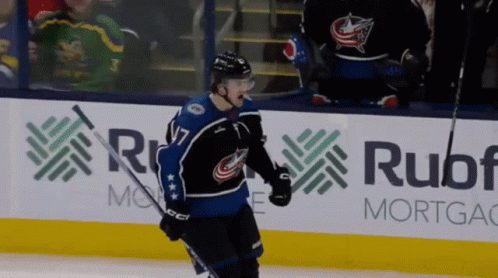 Marcus Bjork, a Columbus Blue Jackets player, celebrates on the ice during an NHL game, with Ruoff Mortgage visible.