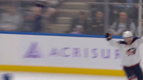 Marcus Bjork of the Columbus Blue Jackets celebrates a goal on the ice with teammates.