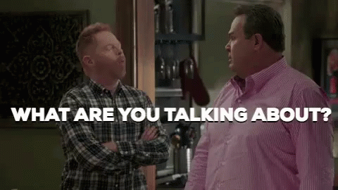 Mitchell and Cameron from Modern Family in a confused exchange, with the caption 'WHAT ARE YOU TALKING ABOUT?'.