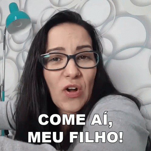 Diiirce, a woman with glasses, speaks directly to the camera, saying "Come Aí, Meu Filho!" (Eat up, my son!).