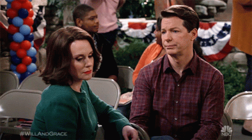 Karen Walker comforts Jack Mcfarland in a scene from Will & Grace, showing emotional support.