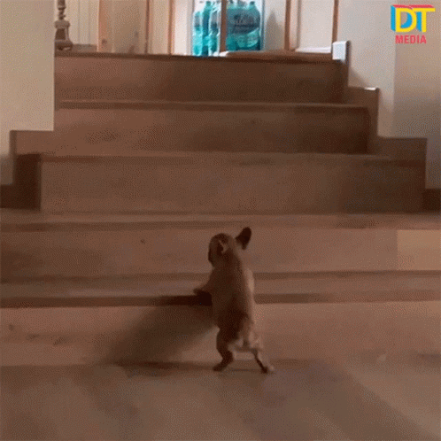 A French Bulldog puppy adorably struggles to climb a set of wooden stairs, showing determination.