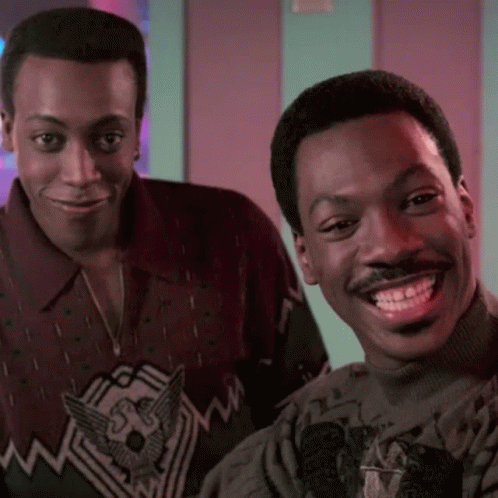 Eddie Murphy and Arsenio Hall as Akeem and Semmi from Coming to America, sharing a laugh.