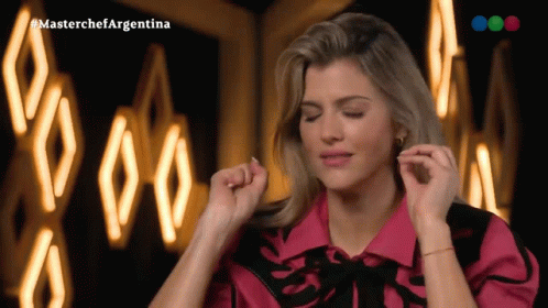 Mery Del Cerro reacts with expressive gestures on Masterchef Argentina, wearing a pink shirt.