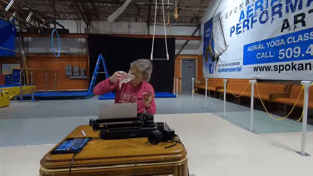Eliana interacts with a friendly cartoon computer character, Computador Teclas, at a colorful desk.