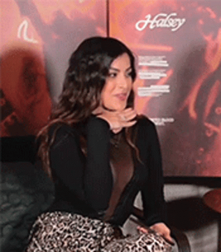 Nah Cardoso reacting with surprise and then nodding, wearing a leopard print skirt, with a Halsey poster in the background.