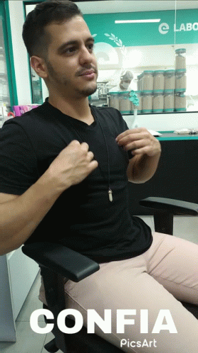 A man, Bemvindo, in a black shirt sits in a chair, adjusting his clothing, with 'Confia PicsArt' visible on screen.