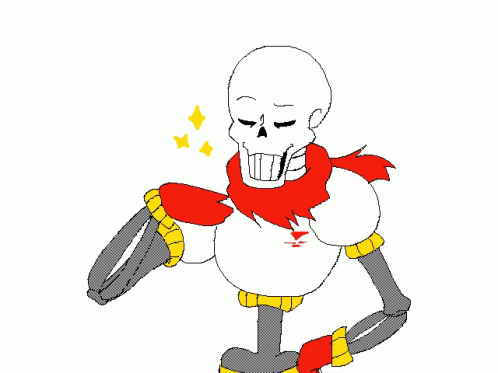 Papyrus from Undertale strikes a confident and proud pose, eyes closed with a wide smile.