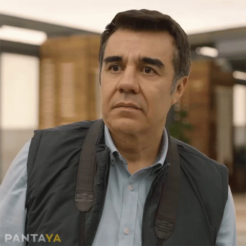 Adrián Uribe as Jesús, looking confused and thoughtful, wearing a vest with the Pantaya logo.