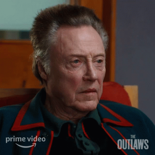 Christopher Walken as Frank Sheldon from The Outlaws gives a confused look, featured on Prime Video.