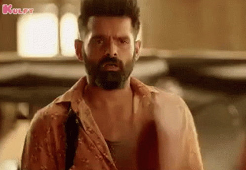 Ram Pothineni shows a confused and shocked reaction in a scene from Ismart Shankar.