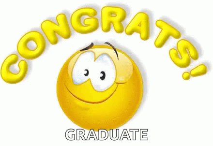 An animated yellow smiley face gives thumbs up with "CONGRATS!" and "GRADUATE" text.