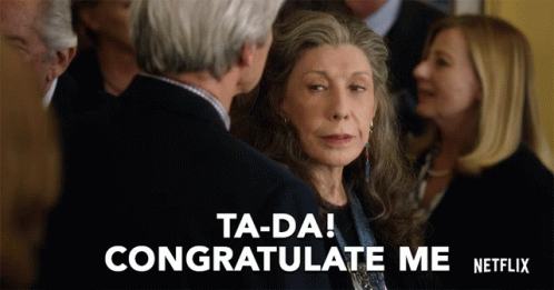 Frankie Bergstein (Lily Tomlin) exclaims 'Ta-Da! Congratulate Me' in a crowd.