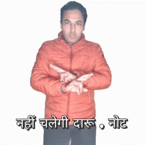 Man in orange jacket passionately delivers a political slogan: 'Alcohol will not work. Note' in India.