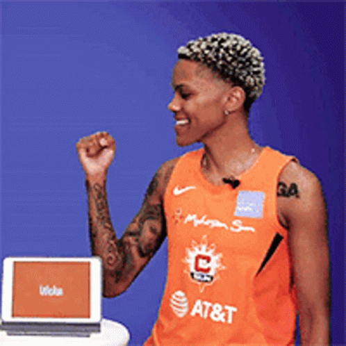 Courtney Williams of the Connecticut Sun celebrates with a raised fist, smiling in her orange AT&T jersey.