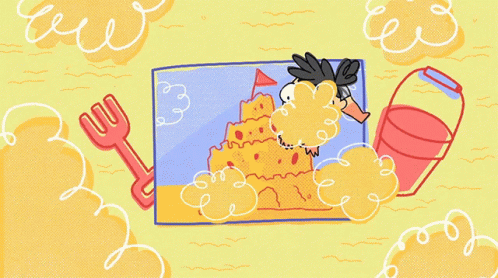 Fracasitos builds a magnificent sandcastle on the beach, celebrating his creation with joy.