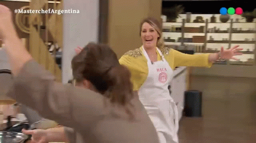 Mica Viciconte shares a joyful hug with another woman on the set of Masterchef Argentina, both looking very happy.