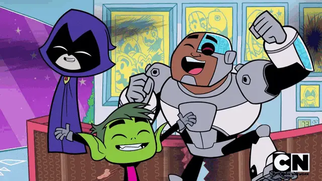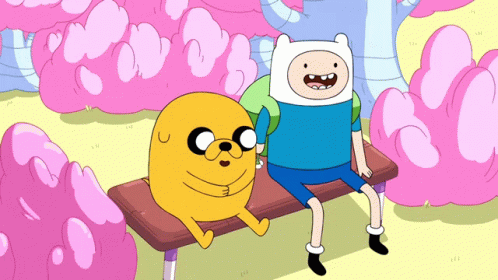 Finn and Jake from Adventure Time sitting happily on a bench in a vibrant, pink-treed landscape.