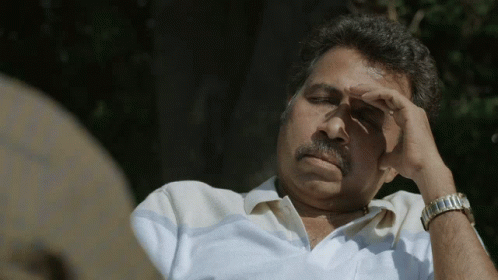 Uday from Panchayat looking thoughtful or stressed, with his hand on his head, wearing a watch.