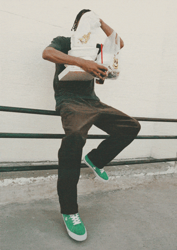 A person showcases green Converse One Star Pro Suede sneakers, sitting on a railing and pressing a crosswalk button.