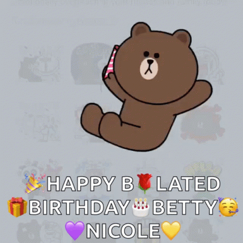 Brown Bear (Cony Brown) celebrates Betty Nicole's belated birthday with confetti and a party popper.