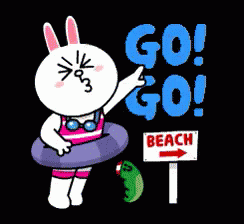 Cony the bunny points excitedly to a 'BEACH' sign, urging everyone to 'GO! GO!' for a fun day.