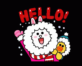 Cony and a duck in winter attire wave hello with snowflakes falling around them.