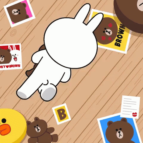 Cony from LINE Friends lovingly hugs a small Brown plushie on a wooden floor, surrounded by more Brown memorabilia.