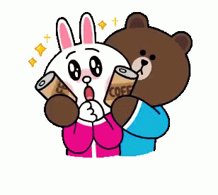Cony and Brown, the cute cartoon couple, hug affectionately while holding cans of coffee.
