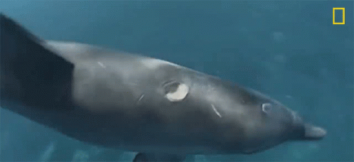 A close-up underwater view of a dolphin with a distinctive cookiecutter shark bite mark, as seen on National Geographic.