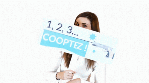 A woman holds a sign that reads '1, 2, 3... COOPTEZ!' with a gun icon, promoting co-option for work.