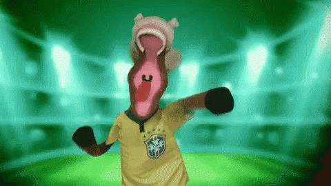 Excited horse mascot in a Brazil jersey celebrating the 2018 World Cup with a stadium background.