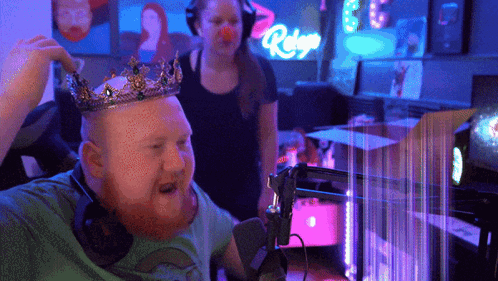 a man with a crown on his head stands in front of a neon sign that says " ridge "