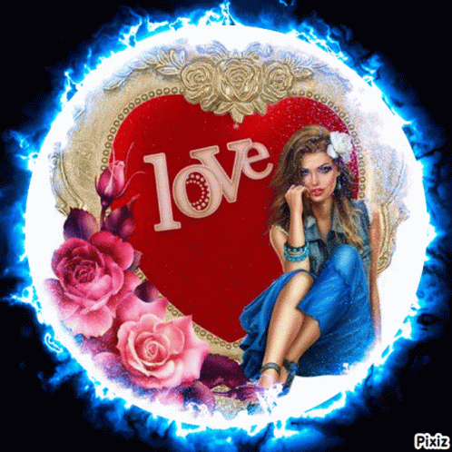 A woman sits gracefully in front of a vibrant red heart, adorned with roses and the word 'love'.
