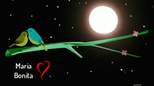 Two animated birds on a branch under a full moon, with "Maria Bonita" and a heart written below.