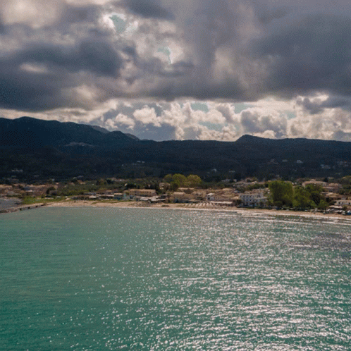 Aerial view of the beautiful Roda Beach coastline in North Corfu, Greece, under a dramatic cloudy sky.